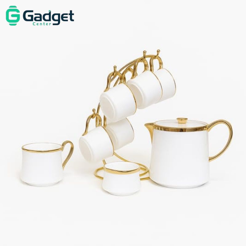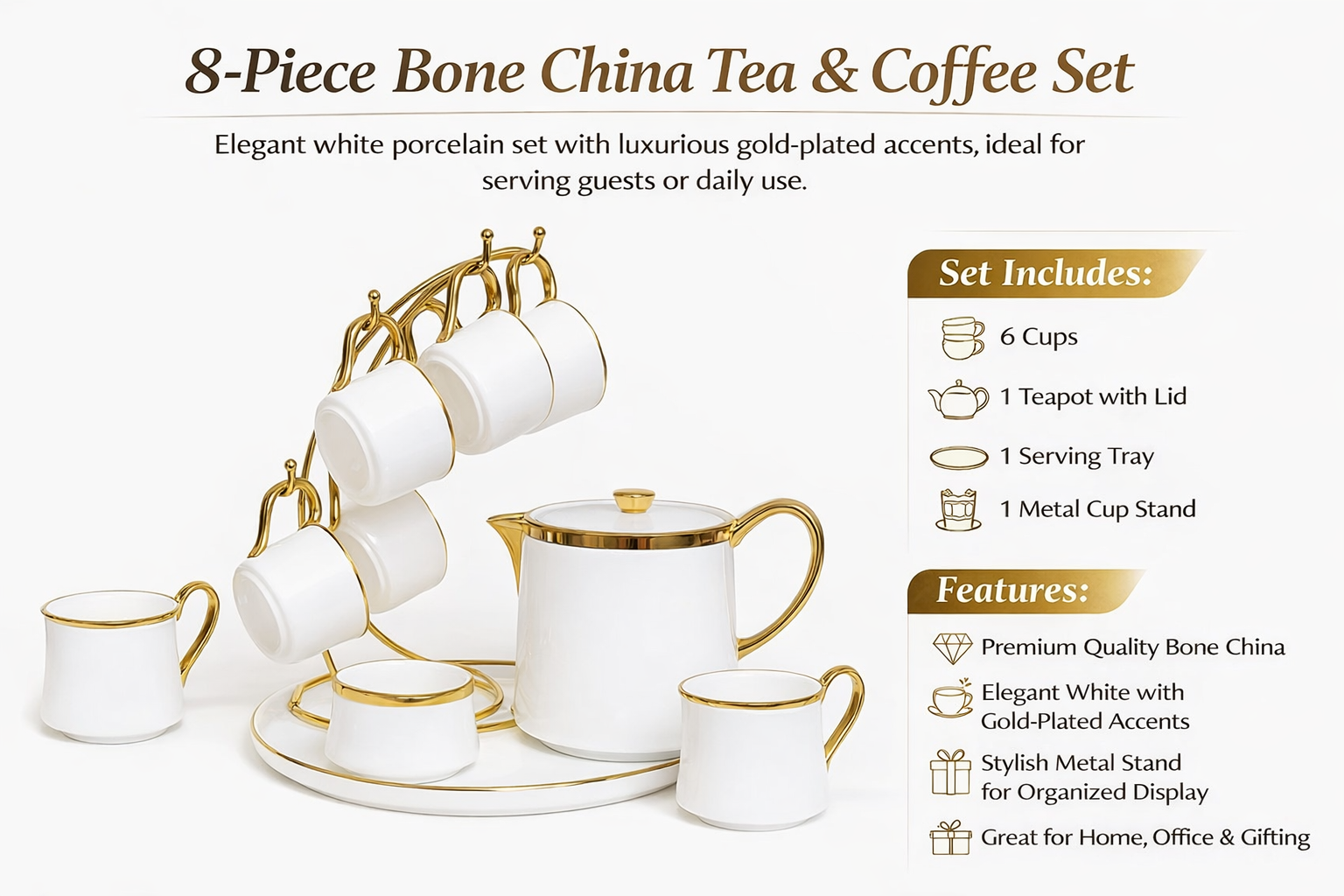 This elegant 8-piece Bone China tea and coffee set features a premium white porcelain finish with luxurious gold-plated accents. Perfect for serving guests or daily use, the set includes six cups, a teapot with lid, a serving tray, and a stylish metal stand for organized display. Ideal for adding a classy touch to your table setup.