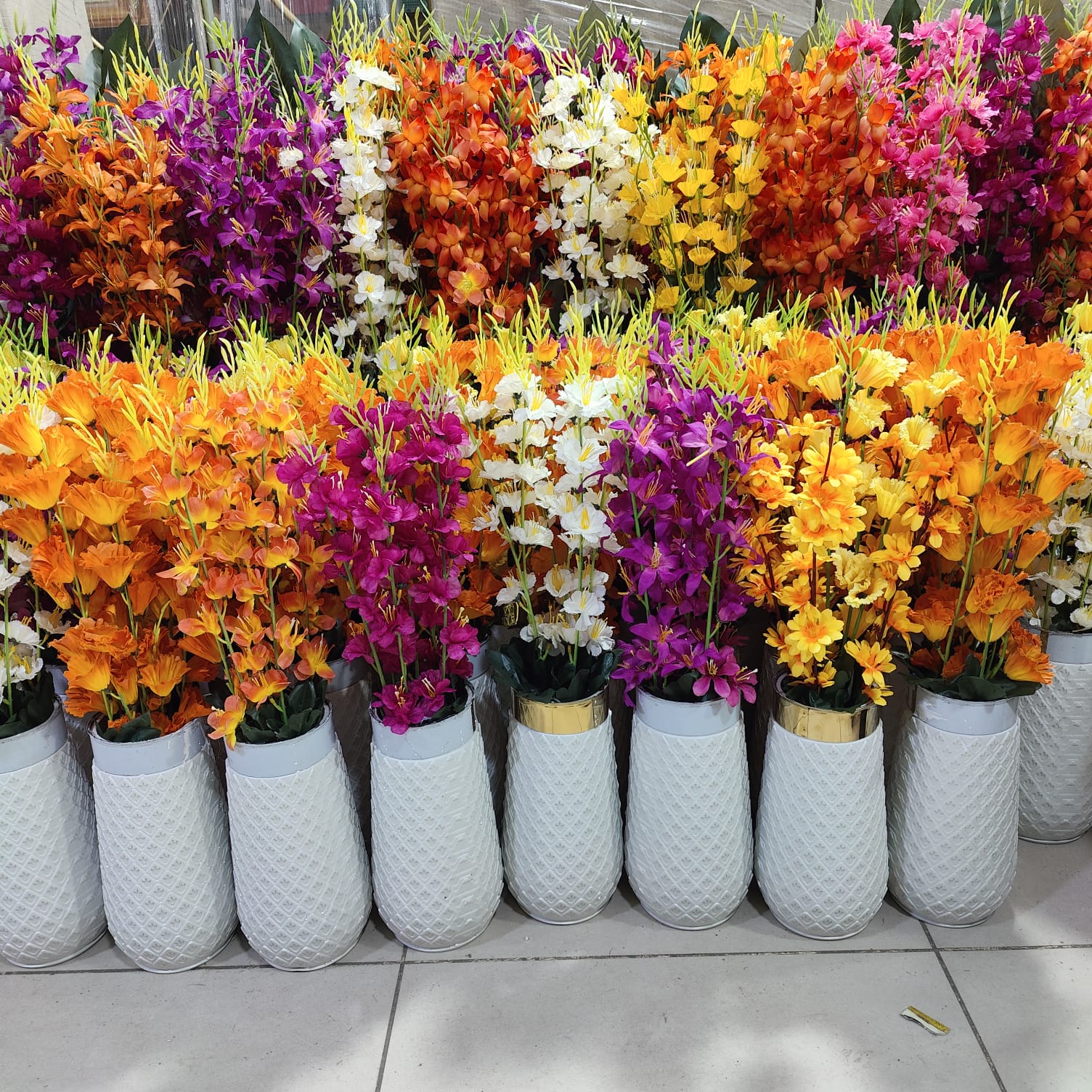 - Color Palette: Vibrant blooms in orange, purple, white, and yellow, creating a lively and luxurious display.